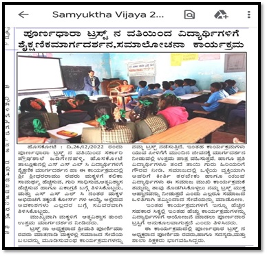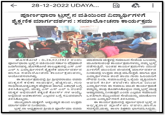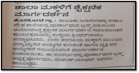 Educational guidance and consultation program was organized by Poorna Dhara Trust for SSLC students at Government High School Jadigenahalli, Hosakote taluk on 26/12/2022. In this programme, Sridhar Ramu taught children about increasing learning abilities, goal achieving, confidence boosting and concentration, and selection of courses as per children’s taste after SSLC, opportunities there were detailed. Especially, the children were filled with confidence and gave good guidance. Poornima, President of Purnadhara Trust, and members, and school teachers participated in this program.